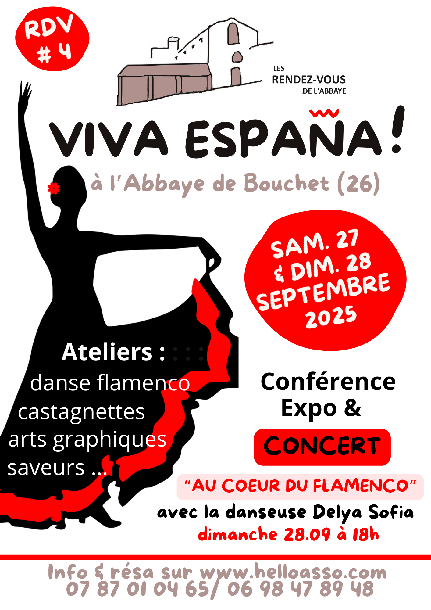 Le temps d’un week-end, l’Abbaye de Bouchet s’est mise aux couleurs de l’Espagne avec Viva España ! Un rendez-vous festif dédié à la culture andalouse et à l’art du flamenco. Ateliers pour enfants et adultes (castagnettes, danse sévillane, création d’éventails), conférence dansée sur l’histoire du flamenco, dégustation de saveurs espagnoles et concert exceptionnel ont rythmé ces deux journées conviviales. Entre musique, danse et gastronomie, le public a pu découvrir toute la richesse et la passion de la culture espagnole. Allez à la rencontre de tous les artistes présents à ce RDV#4